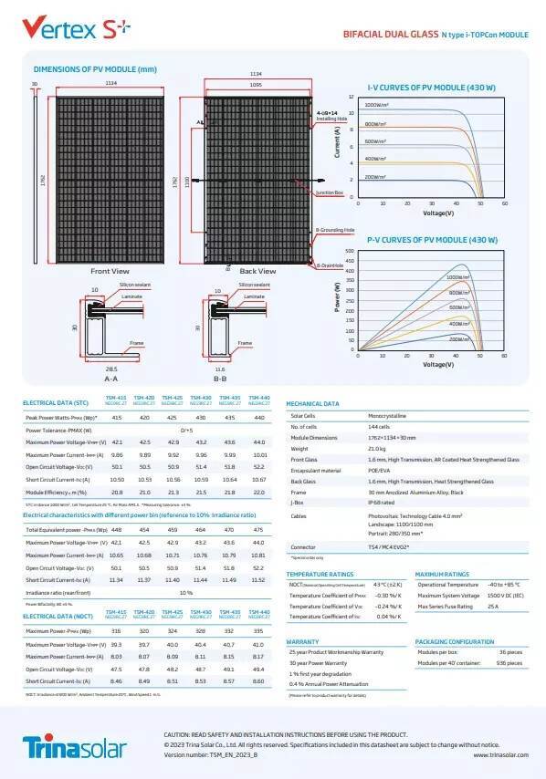 Released in 2022, the Vertex S+ is Trina’s first N-Type panel. With a Dual-glass design, the S+ offers high reliability to harsh conditions and better light trapping for high power output. The Vertex S+ offers a universal solution for residential and C&I systems, designed for compatibility with most mainstream inverters, optimises and mounting systems.